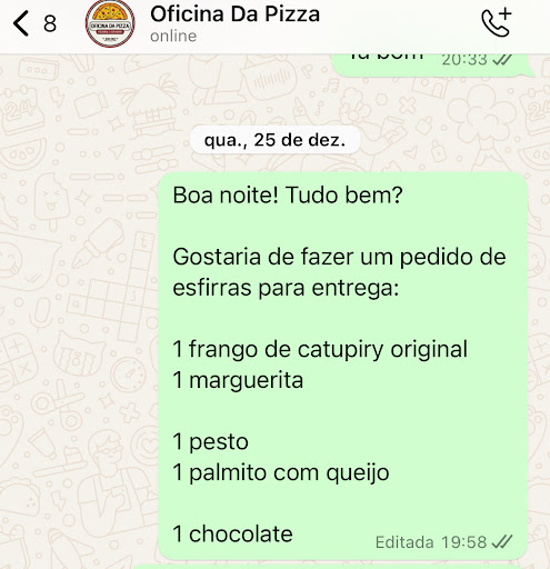 Read moreGostei da esfirra aberta e sempre fui muito bem atendido. Mas ontem realizei um pedido pelo WhatsApp, mas estava demorando para ser atendido, então resolvi telefonar. O celular não atende embora esteja informado na caixa da pizza/esfira. O telefone fixo atendeu, ouvi ruído de fundo e desligou em seguida. Depois só sinal de ocupado. Até aí tudo bem. O problema foi quando fui buscar as esfiras. A atendente (acho que é a proprietária) que estava no computador e também atende o telefone fez pouco caso quando comentei sobre o atendimento pelo telefone não dando atenção aos meus comentários e sendo muito arrogante. Comentei que se não consegue prestar um bom serviço pelo telefone é melhor cancelar ou resolver para não perder o cliente. Vou voltar lá na próxima semana para ver se o serviço melhorou. Este é daqueles casos em que tem um bom produto, mas um funcionário/proprietário sem capacidade de...