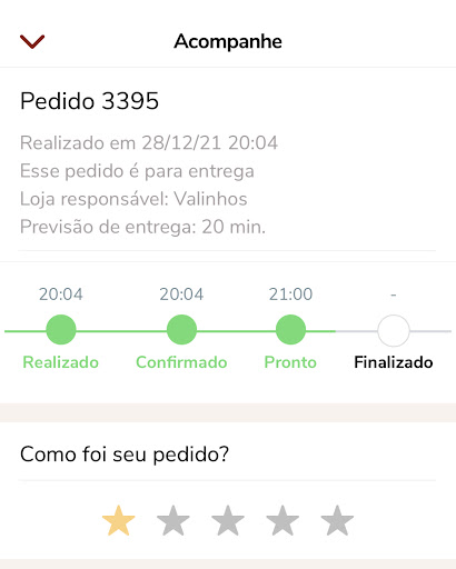 Decidi fazer meu primeiro pedido com este estabelecimento e que péssima idéia foi. Usei o site para faze-lo, e foi registrado as 22:38 (o horário de funcionamento para pedidos no delivery é até as 23:00, de acordo com o site). Em nenhum momento o status do pedido mudou de "realizado/enviado" para siquer "confirmado", muito menos entregue.
