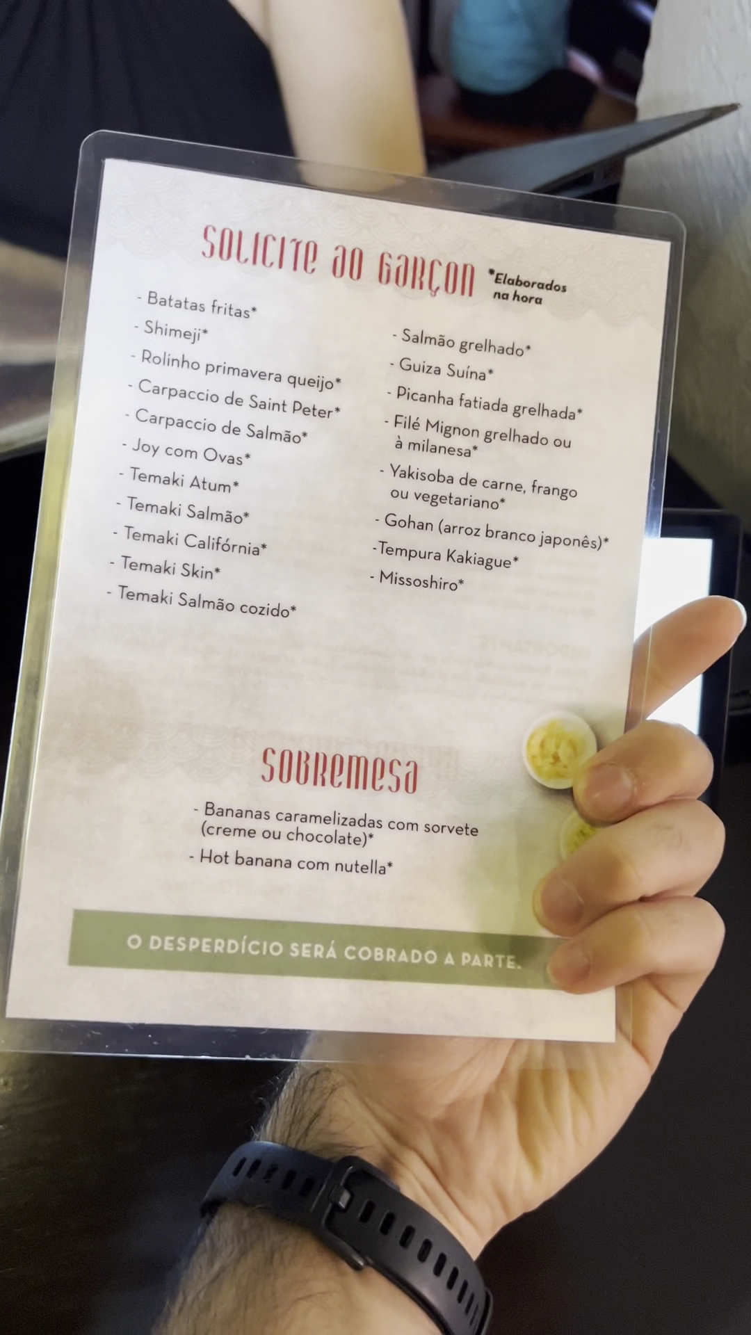 O cardápio deles é pelo tablet, achei bem legal. E pede-se tudo por lá, inclusive, no rodízio, as repetições e quaisquer outras opções estão lá. O que para mim é perfeito, exatamente porque muitas vezes em rodízios acabamos não pedindo ou pedindo menos de algo por não sabermos que tem ou esquecermos sem o menu em mãos.
