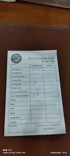 Read moreMuito bom, fui com minha família conhecer o lugar e amamos muito... Ambiente limpo e aconchegante, não tem mosquitos, comida boa, o cupim é maravilhoso, os colaboradores do local são todos educados e bem atenciosos... Fomes bem recepcionados na entrada e na saída... Local para estacionar o carro na av e não tem nenhum perigo e preço justo. Porém faltou 2 estrelas por eles não colocarem os valores das bebidas na fixa da mesa, deveria ter um cardápio com todas as bebidas que eles servem e valores, do mesmo jeito que tem em amostras o valor do almoço... Se colocar um cardápio com os valores vai ajudar bastante muitas pessoas... Tirando isso que citei em valores de bebidas... Eu Super Recomendo o Rei do Cupim.. Bom Trabalho a todos os colaboradores e...