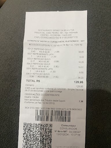 Read moreNão gostei, muito caro pelo local R$ 92,00 o kg, comemos muito pouco e paguei em em 3 refeições 130,00 eu comi só salada, minha cunhada comeu bem pouco porque tem problemas de estômago e minha esposa pegou um pouco mais , mas não ultrapassaria 500g, no final minha esposa pegou 3 mini pastéis e 5 pedacinhos de torresmo ficou r$ 40,00 reis. Muito cuidado! Não recomendo, porque reclamei e o cara né se dignou a conversar! Desconfio que não estavam tirando a tara do prato! Devia ter chamado a polícia, mas para evitar o estresse deixei pra lá! E a comida não é lá...