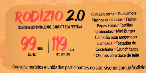 Read moreO Sin Señor Tex Mex oferece uma experiência imersiva, com um ambiente temático e músicas que complementam a atmosfera envolvente. A decoração é bem pensada, trazendo um toque autêntico e acolhedor.