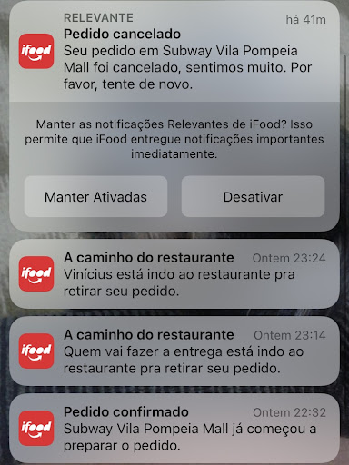 Estou extremamente insatisfeito com o Subway da Vila Pompeia. Fiz um pedido através de um aplicativo de delivery por duas vezes, pois minha esposa, que está grávida, escolheu esse restaurante para se alimentar. Para nossa surpresa, ambas as vezes o pedido foi cancelado sem nenhuma explicação ou aviso prévio.