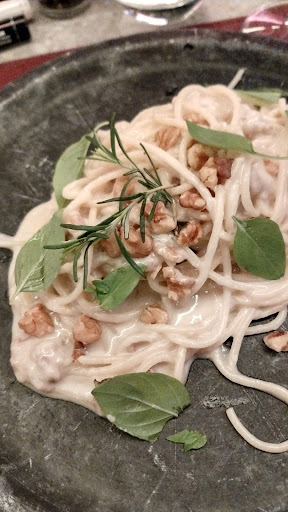Negativo: pratos são "hit or miss". Esposa pediu um prato com camarões e estes estavam duros (passaram do ponto de cozimento). Filha pediu um espaguete à carbonara e achou ruim. O meu gnocchi com brie estava bom, gostei, mas o gnocchi (massa) podia ser ainda melhor.