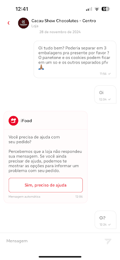Hoje 28/11/2024 fiz meu pedido pelo aplicativo, tentei contactar a loja e ninguém me respondeu. O antigo funcionário era excelente e sempre me respondia para me atender com excelência. Eu não compro uma vez ou outra, eu compro sempre há muitos anos porém ultimamente o atendimento principalmente pelo iFood está deplorável, vou passar a comprar no concorrente mas não compro mais na cacau show, parece que estão fazendo um favor em responder o cliente. Só pra frisar, em respondeeeeer, é um absurdo, vocês por acaso não dão valor ao cliente? Eu tive o prazer de conhecer o dono da franquia Cacau Show, e uma das coisas que ele mais presa é a qualidade do atendimento, espero que essa avaliação seja levada em consideração e que o atendimento volte a ser como antes. O principal motivo de ter me tornado um cliente regular e estar sempre comprando aqui era o excelente atendimento, a primeira coisa era lembrar do atendimento então escolher a loja para presentear alguém, ultimamente acontece a mesma coisa, eu lembro do atendimento e procuro outra loja. E no final depois demais de uma hora ainda...