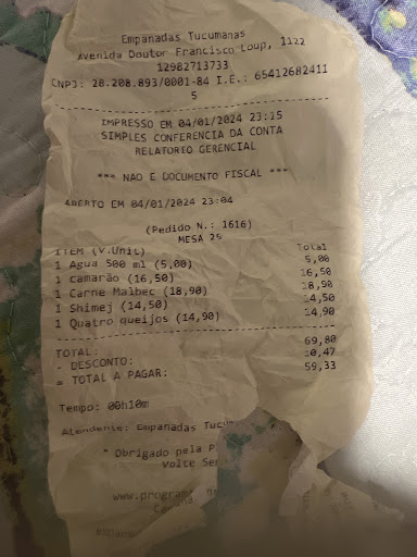 Read morePior experiência de Maresias. Assim que chegamos, pedimos o chopp que estava no cardápio, não tinha. Fizemos os pedidos das empanadas. Depois de 1 hora o pedido não chegou. Reclamamos e a dona do estabelecimento falou que a nossa demorava mais pq estava congelada. No entanto, depois de 5 minutos o pedido chegou errado. Claramente esqueceram de pedir. Pior, o pedido veio errado, trocaram a empanada de escarola por shimeji e esqueceram de trazer a empanada de camarão. Como já era tarde, optamos por ficar com o que trouxeram, mas, no final, ao invés de abaterem o valor total da empanada que veio errada, deram um desconto de 10,47 no valor total da conta. A empanada é ok mas nada demais. Não vale o...