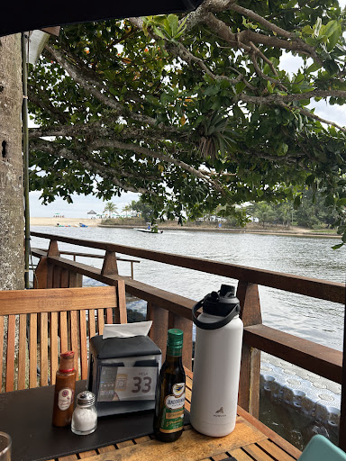 Pouca espera, nos colocaram na parte de fora, em uma mesa e cadeira de plástico. Até que a vista é legal. Em frente ao rio com as lanchas.