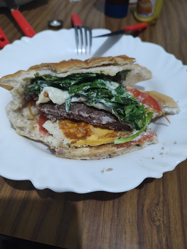 Pedi 2 lanches pelo Ifood: X egg salada com rúcula ( hambúrguer artesanal de costela 130 Gr, ovo frito, tomates, maionese, mussarela e rúcula) e X salada com milho e rúcula ( hambúrguer artesanal de costela 130 Gr, milho, tomates, maionese, mussarela e rúcula), no pão de hambúrguer. Opcional rúcula ou alface, e pode ser pão francês ou pão de hambúrguer. A carne bem temperada, suculenta, saborosa, o pão passa na chapa, tem casquinha crocante. Os lanches são enormes, vem muito recheio. Para ter um parâmetro, esse prato da foto tem quase 24 cm de diâmetro e coube a metade do lanche, já tinha comido a outra metade quando lembrei...