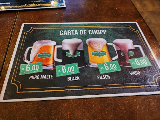 A choperia do patrão me surpreendeu. Exemplo : compramos 3 porções grandes, 2 drinks e 6 choppes, dando um total de 139 reais e serviu 5 pessoas ( e sobrou porção ainda).