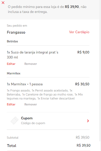 Quando comecei a fazer pedidos (pelo ifood), bem no começo, pedia apenas uma marmita comum, que apesar de ter uma entrega mínima (se não me engano 25 ou 28 reais) passava normalmente. Após alguns pedidos, eles aumentaram novamente, agora para eu conseguir comprar, eu teria que pedir uma marmita mais alguma coisa. Tive que pedir então uma marmita e um refrigerante lata, visto que tem a tal ''entrega grátis''. O que ficava em torno de 37,50$, o que já não era barato, visto que por mais que seja no ifood, existem ótimas marmitas concorrentes sendo vendidas a 23 reais. Obviamente isso não durou muito tempo, ambiciosos aumentaram o valor para 39 reais o pedido minimo, então tive que pedir a marmita e uma coca 1 litro ou 1 suco, se quizesse comer nesse restaurante, ficando ao todo 39 reais, fui tolerando todo esse abuso. Agora novamente fui pedir a mesma marmita e um suco ou refri 1 litro, e o pedido minimo aumentou para 39,90, ou seja, aumentaram algo em torno de 50 centavos na safadeza, querendo que você cliente, ainda compre alguma coisa a mais, mesmo eu reclamando sobre isso, nada fazem. Obviamente se eu tolerar isso, não vai demorar para o pedido minimo se tornar 42 ou 45 e assim por diante, não comprarei novamente nesse estabelecimento, pois muitas vezes pedia 3 a 4x por semana. Isso pode não parecer muito, algo em torno de 150 reais por semana, mas por mês da quase 600 reais e por ano? a cada 2 anos, será 14,400 reais meus que vocês não terão mais, um abuso e falta de respeito com o consumidor! Da mesma forma, recomendarei a amigos que antes falava comer lá pessoalmente a não fazer...