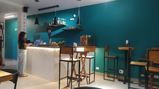 Tem mesas para duas pessoas, mesas maiores, para 4 pessoas e as mesas bistrô que ficam ao lado do único balcão, onde são preparados os drinks.