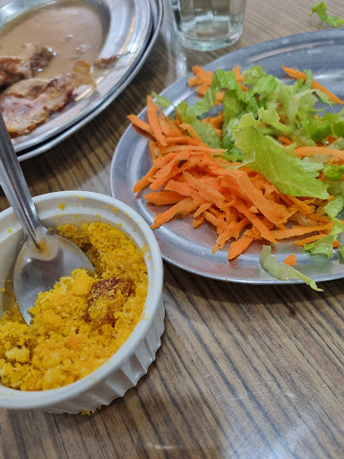 Seria com churrasco segundo quem nos abordou porém não veio nada disso (estávamos em 4 pessoas), sendo apenas 3 bifes onde 1 tivemos que pedir depois esperando vir em maior quantidade porém não veio e ainda recebemos ele "frito" ao invés de carne assada. A linguiça toscana mais queimada que carvão. O que salvou um pouco foram os vinagretes, farofa, uns 2 bifes de frango, um pouco do arroz e um pouco da batata frita que ainda sim haviam queimadas.