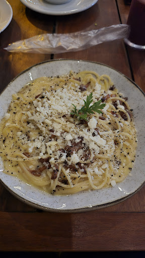 Read moreAtendimento adequado, porém pecou por não retirar o prato ao perceber que eu tinha terminado e pela demora absurda em identificar a indisponibilidade de uma sobremesa que foi pedida com antecedência. A cabonara lá Vera está boa, com a pancetta utilizada deliciosa. O suco de frutas vermelhas não agradou muito. Ainda, todo o cheiro de fritura da cozinha acaba invadindo a região das mesas, o que é desagradável e deixa as roupas com cheiro de gordura. Por fim, como forma de compensar a ausência da sobremesa pedida, foi fornecido um pudim como cortesia. Antes não tivessem, porque o pudim é terrível e eu não...