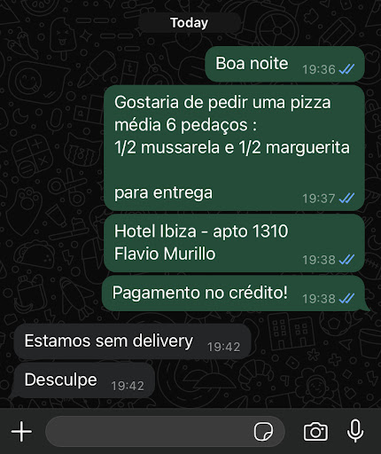 Read morePéssima, fiz o pedido da pizza pelo Whatsapp, me informaram que demoraria 40 minutos, não moro muito longe da pizzaria, fiz o pedido às 19:15 e só chegou em casa às 20:37 hs, e fria. Minha casa tem interfone e o motoqueiro não apertou o interfone, fiquei sabendo que chegou porque ouvi uma buzina tocando fraquinha....