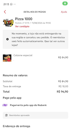 Fiz o pedido no Ifood, paguei antecipadamente, depois que já estava certo cancelaram o pedido por não entregar no meu bairro (Colônia), moro a 12 minutos do restaurante, infelizmente a empresa perdeu um cliente que conheceria pessoalmente, o Ifood da opção para a pizzaria escolher os bairros que atendem, para não precisar ter esse tipo de inconveniente, até pq é a primeira vez que acontece isso comigo na plataforma usando quase 10 anos, quando não tinha tantas opções, e uma empresa para se destacar precisa ser coerente pois a plataforma te ajuda a segmentar sua região de atuação, infelizmente fica aqui minha insatisfação...