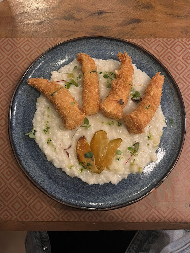 Sobre a comida: pedimos os arancini de entrada (4 bolinhos por R$ 35). Estavam ok, bem fritos, só faltou um pouquinho de sal. Foi o que mais agradou. Nos pratos principais, pedi um risoto de queijo com limão, maçã e camarão empanado. Achei muito ácido, acabou ficando difícil de comer. Esse prato inclusive veio pouquíssimo risoto. O camarão estava bem empanado, fritura bem feita, quantidade e tamanho dos camarões era ok. Acabei trocando com o prato da minha esposa. O dela foi o nhoque tartufo, que infelizmente tinha gosto bem forte de farinha, ficou pesado. O bacon estava gostoso e crocante, mas no geral o prato não agradou. Ambos os pratos chegaram frios. Decidimos nem pedir sobremesa.