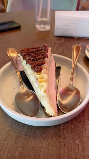 Após o brunch, decidimos experimentar o cheesecake de frutas vermelhas. Infelizmente, este foi o ponto mais decepcionante da visita. O cheesecake estava extremamente seco, com um recheio pesado e pouco sabor de frutas vermelhas, devido à densidade e intensidade do sabor do recheio.