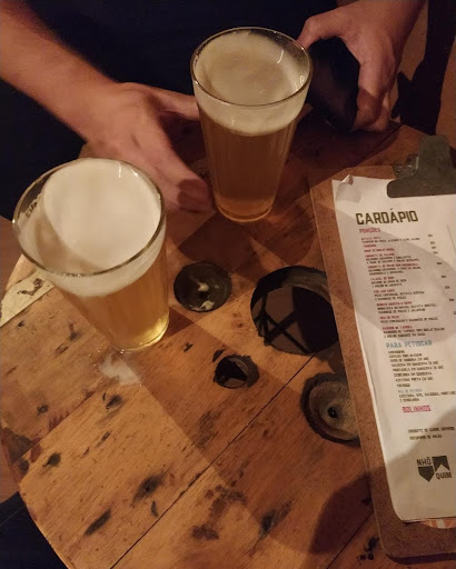 Pedimos apenas dois chopes, pois a fila de pessoas atrás não te deixa nem respirar direito, quem dirá ler o cardápio e escolher algo. Ah! E detalhe que também não há cardápios nas mesas. Tivemos que solicitar um no balcão para tentar decidir o que comer com um pouco mais de calma.