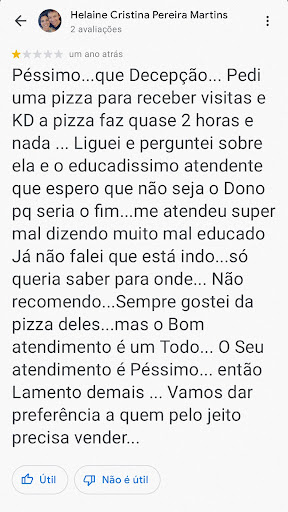 Read more1 estrela pq não consegui colocar 0... Fiz o favor de escolher a pior pizzaria pra comemorar o DIA MUNDIAL DA PIZZA com a minha familia... 1°liguei pra saber o valor e o atendente disse pra eu procurar no site, pq tem mais de 60 sabores e não daria pra me falar um a um, nem me perguntou qual sabor eu queria saber o valor; 2° Entrei no site e escolhi, fui até a pizzaria para pedir, o atendimento é horrível, a pessoa fala contigo e ao telefone ao mesmo tempo, não sabe informar quais os cartões que são aceitos; 3° Escolhi a de 13 pedaços, finalmente a pizza ficou pronta, trouxe pra casa e qual foi minha surpresa qdo abri a embalagem? Os pedaços são do tamanho de pedaços de rodizio, a massa fina como um papel sulfit e queimada, dura, não cortava, quebrava... A mussarela de bufala gelada e as calabresas queimadas... Enfim... 62,00 jogados no lixo e uma expectativa frustrada! Muito obrigada...