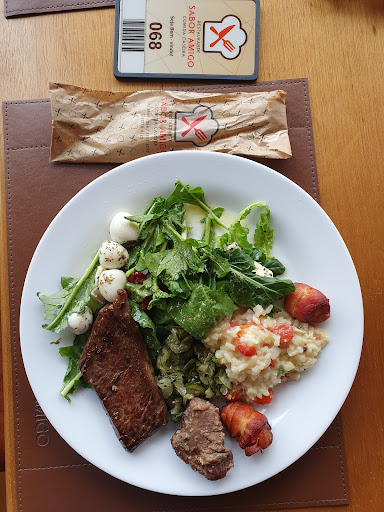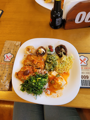 O restaurante Sabor Amigo apresenta um ambiente moderno e acolhedor, ideal para encontros casuais e refeições em família. No entanto, o espaço físico torna-se ligeiramente apertado devido à grande quantidade de mesas, o que pode comprometer o conforto em horários de maior movimento. O estacionamento próprio, apesar de pequeno, é um diferencial positivo, dada a localização urbana.
