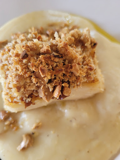 Pedimos salada Maré de folhas com Parma e pupunha e o prato principal filé de pescada com molho de camarão ( que vieram 6 camarões no molho) com farofa de banana e pirão. Como temos restrição alimentar, pedimos para não vir o arroz e acredito que tenham aumentado a quantidade de filés, pois veio uma porção bem generosa. Comida...