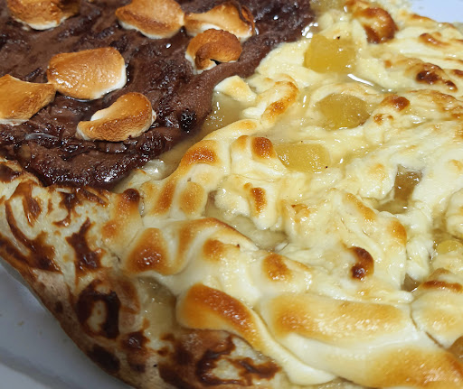 O recheio da pizza doce chocolate ao leite com marshmallow é muito boa... Já a de abacaxi com chocolate branco acaba ficando um pouco doce demais mais vale a pena provar e o bom que um pedaço dela te deixa satisfeito! (Talvez se fosse um abacaxi em natura ou ficaria um sabor mais...