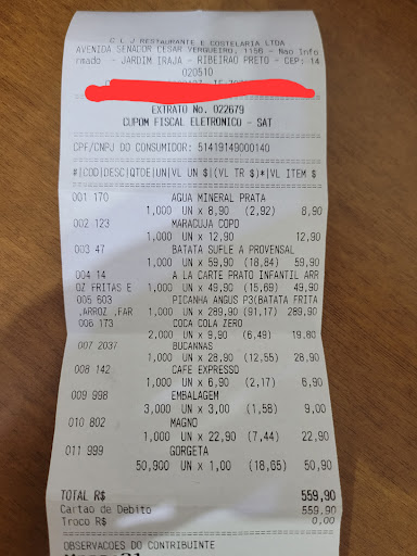 Read moreEu e meu marido nos sentimos lesados! Ao chegar, o garçon ofereceu uma entrada, mas não disse que seria cobrado. Não me importaria em pagar, desde que avisado. Uma porção de batatas chips, completamente enxarcada! Tudo que pedimos, tivemos que lembrar o garçon duas ou três vezes, porque ele esquecia de trazer, desde as bebidas, as sobremesas e o café. Precisei levantar várias vezes e localizar o garçon para lembrá-lo dos pedidos. Pedimos uma porção de picanha para três pessoas, mas vieram apenas quatro filés. Porém, nos cobraram o valor de seis. E ainda demorou mais de uma hora para chegar. O ambiente é muito barulhento, quente, e o ar condicionado da brinquedoteca estava quebrado. Ainda nos cobraram nove reais pela embalagem de viagem. Nem no Camarada Camarão a embalagem é tão cara! A conta para um casal e uma criança, sem bebidas alcoolicas, deu quase R$ 600,00! Pedimos apenas um prato adulto e um infantil! Arroz, picanha e farofa....