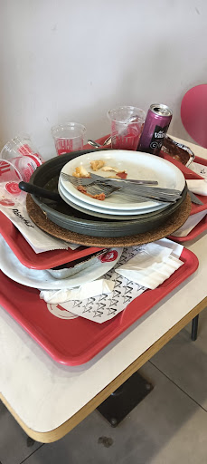 Depois que finalmente meus filhos comeram, observei que o mesmo moço que estava atendendo, saiu e começou organizar e se atentar com as mesas e bandejas com restos de comidas e os pratos de louça na onde o pessoal já haviam comido.