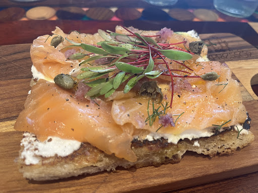 I order the salmon Gravlax toastie and, truth to be told, it was awesome, flavoursome, well balanced acidity, correct textures, warm without interfering with the marinated salmon and last but not least, perfect baby beetroot microherb. All in all really good! Pain au chocolate suppose to be the star in the show, it’s coming…very crunchy, warm, buttery… it seems to hug you when you bite it!!! Congrats people,...
