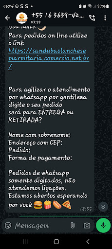 Read moreFiz um pedido pelo aplicativo para retirar, deu o tempo estimado para a retirada, cheguei até além do tempo estimado e o lanche ainda não estava pronto, aí começou a correria pra entregar meu lanche com ingrediente cru, queijo nem estava na temperatura e quando cheguei em casa fui comer o lanche faltava um dos ingredientes que constava no cardápio. Não é a primeira vez que acontece algo do tipo. Fiquei com a impressão que pegaram o lanche do meu pedido e mandaram para outro cliente. Acho que é um problema de administração, pois antes não era assim. A estrutura física era menor éramos bem atendidos de repente com estrutura física maior e um atendimento ruim. E se o tempo estimado pelo aplicativo não é o suficiente aumente o tempo, pois é um desrespeito vc chegar no local ter q esperar e ainda levar um lanche mal preparado pra sua casa. Já desinstalei o Aplicativo Sandubao. Recebi a resposta padrão do proprietário dizendo que a minha avaliação era importante pra ele, imagina se não fosse hein ? Do que adianta ampliar o atendimento pra pizza, Marmitex, se o carro chefe no caso o lanche e o atendimento...