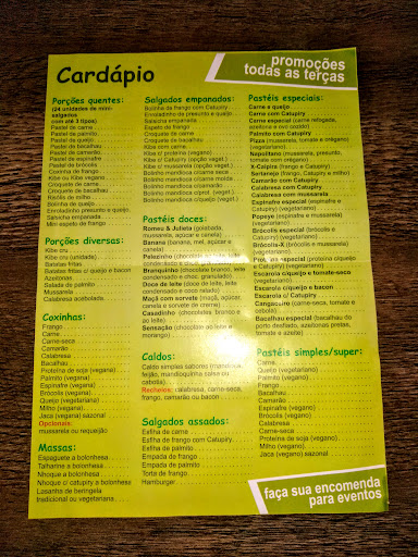 Serviço: Aqui o negócio esquenta. Pelas avaliações passadas, parece que não mudou muita coisa. Pedi 7 salgados que levaram em torno de 1h para ficarem pronto. Quando fiz o pedido, o rapaz que estava no balcão aparentava ser um pouco desinformado, não sabendo demonstrar, exatamente, as diferenças de tamanho entre os pastéis (existem três tipos: normal, super e especial, esses últimos possuem sabores exclusivos). Após feito o pedido, o menino citado não nos informou quanto tempo em média levaria para os salgados ficarem prontos. Conforme o tempo foi passando, minha vontade de ir embora foi aumentando, visto que não havia UMA alma viva para nós dizer se faltava muito ou pouco tempo. Vários pedidos iam saindo, mas nada do nosso. Muito tempo depois (no mínimo 1h de espera), os salgados finalmente saíram.