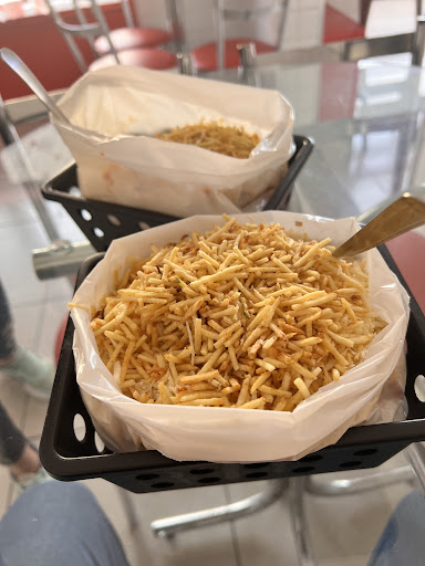Não tm atendimento na mesa, é estilo carrinho de rua mesmo, entra na fila, pede, o querido (q n sei o nome, perdão rs) faz o lanche na hora, vc pega e vai sentar (tem mesas dentro e fora).