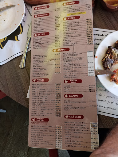 Restaurante grande. Cerca de 50 lugares próximos ao parquinho. O atendimento foi rápido. Pedimos filé mignon a parmegiana (165) e uma porção de filé mignon acebolado com alho (110). O mignon acebolado serve 3 pessoas com fome moderada e vem acompanhado de batatas fritas, arroz, mandioca cozida, pão de alho, vinagrete e farofa (foto - já tínha me servido) A parmegiana vem sozinha, com 6 ou 7 filés grandes. Molho de tomate de verdade. Pedimos uma pinacolada (30) que estava muito boa. A criançada só não aproveitou a cama elástica pois estava no Sol...