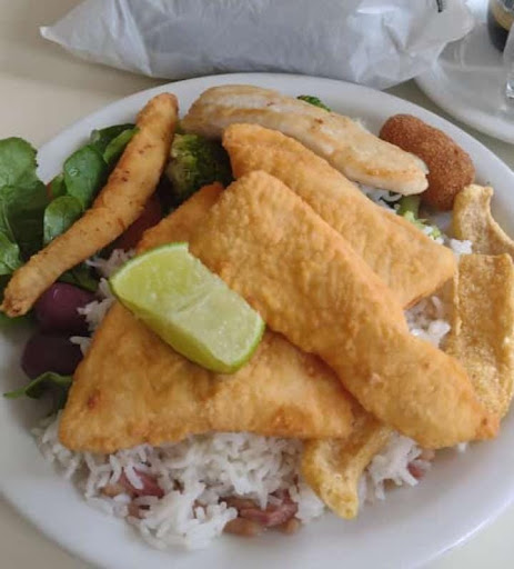 Um prato com pouco arroz . Brócolis três filé de dourado de uma rodela de tomate deu 67$ reais com um suco de laranja 🍊 copo cheio conta deu quase 90$