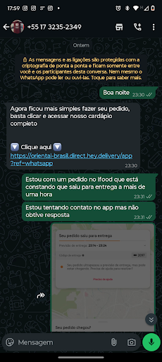 Consideração zero pelo cliente. Fiz um pedido pelo Ifood 22h, restaurante fechava as 23h, pedido foi aceito e as 22h22 foi informado que havia saído para entrega. Previsão era até às 23h15, estranhei estar quase uma hora em rota de entrega então tentei contato com o restaurante, sem sucesso! Sem resposta pelo Ifood, sem resposta pelo whats, NADA! Solicitei o cancelamento do meu pedido, fui informada que o restaurante havia recusado o cancelamento. Ainda bem que o Ifood nos dá a opção de cancelar mesmo assim, então solicitei o reembolso do cartão, e então meia noite fomos dormir sem jantar, eu, meu filho e meu marido. Não indico para...