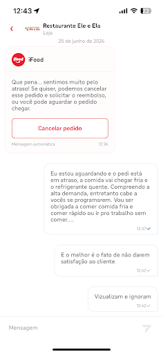 Passadas mais de meia hora do primeiro contato, sem entrega, liguei novamente, pedindo explicações do restaurante, que se comprometeu a falar com o entregador e informar se demoraria muito mais além do que já estava demorando.