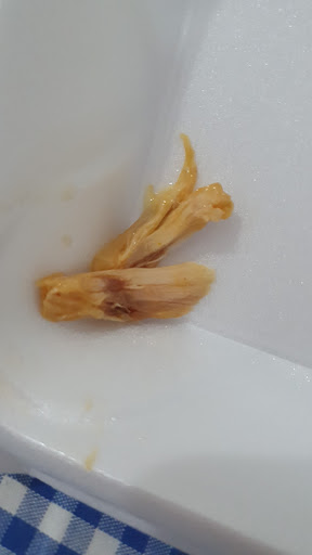 Read moreGosto muito de comer no Moenda, amo os sucos. Entretanto, o atendimento tem caído a qualidade. Pedimos para que colocassem o suco para viagem (a embalagem é paga a parte nesse caso, com um acréscimo) e na hora de entregar o suco não vem na embalagem que pagamos. E isso ocorre toda vez, tem q ficar depois explicando e mostrando na nota pra funcionária, que fica de cara feia. Hoje, dia 04 de janeiro,além de tudo, a torta veio com esse pedaços sanguinolentos de frango e a carne não estava nem desfiada. A torta estava boa, mas ta na cara que foi feita com muita má vontade e pressa. Por R$12,00 o pedaço poderiam ter...
