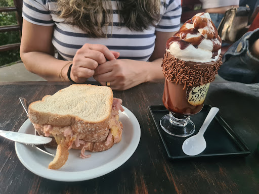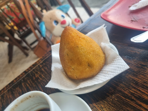 Read moreA ideia é boa mas a realidade não condiz, infelizmente, as fotos bem tiradas dão impressão de um local intimista aconchegante e de bom gosto, mas há muitos pontos a melhorar, o local conta com peças incríveis na decoração, porém, os detalhes de pintura de parede e limpeza das poltronas deixam muito a desejar, principalmente no piso superior. O local nos fundos que oferece a vista, não é seguro para crianças, o parapeito tem vãos muito largos, sendo possível uma criança despencar por ali!! Tem uma área kids bem interessante com espaço para teatro de fantoche, gira-gira (este tb nao é mto seguro, pois um menino com um peso mais elevado ao sentar-se o brinquedo virou, ja que não é fixo no chao), piscina de bolinhas, mas por ter visto um esquilo passando rapidamente pelo patio (algo que achei magnifico!!!) Me fez pensar, não sei pq, (talvez pelo mato nos fundos) que pudesse haver algum inseto nas bolinhas, afinal, o brinquedo fica exposto o tempo todo ... O cheiro do lava rápido no mesmo pátio vem com força se misturar com o aroma do café, o meu infelizmente veio frio... :( Enfim, a comida é normal.. a coxinha de mandioca é ruim muito seca e amarra na boca, o misto quente é feito com presunto ralado, o bolo de cenoura tem uma cobertura muito boa, porem o bolo em si, é peculiar, nao tem aquela leve umidade e maciez de um bolo de cenoura caseiro, minha quiche de Alho poro está muito boa em sabor, mas quente por fora e gelada por dentro ... enfim, tem...