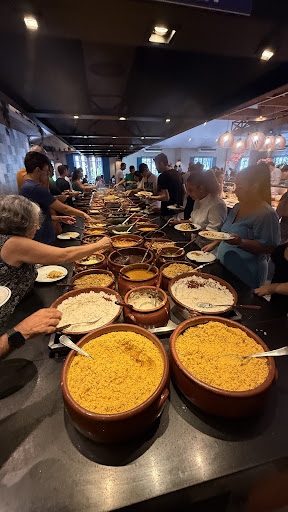 Quanto à alimentação, é um grande destaque. O restaurante conta com três mesas bem organizadas: uma com pratos quentes, outra com grande variedade de saladas e uma dedicada às sobremesas. Todas estavam muito bem abastecidas, com excelente apresentação e variedade para agradar a todos os paladares.