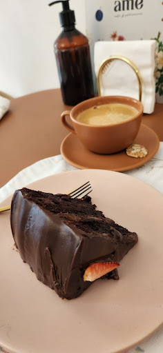 Fui na Âme com minha irmã na tarde de domingo(14/01/24). O espaço é pequeno, tem 2 mesas na parte interna e algumas mesinhas na calçada, mas bem aconchegante. A loja tem uma boa variedade de bolos e doces, que são oncarro chefe. Pedimos 2 fatias de bolo: Cacau & Berries e Lemmon & Berries. Para acompanhar, pedi um cappuccino de Pistache. Os bolos estavam deliciosos, a massa é úmida e bem macia por dentro. Apesar de eu ter escolhido o Lemmon & Berries, meu preferido foi o Cacau & Berries. Mas achei bem gostoso o Lemmon & Berries tbm. Ambos os bolos combinam muito bem com a acidez das frutas vermelhas.....mas por eu não gostar de algo muito doce, o Cacau & Berries ficou melhor no meu paladar. No final achei que estava ficando doce demais para o meu paladar, por conta da cobertura de brigadeiro de ambos os bolos. Tanto que pensei: acho que pegar um bolo pra cada foi muito, pois minha irmã não costuma comer muito e eu não curto algo muito doce, então acho que dava certinho. Ou senão, um bolo ao estilo Naked Cake teria ficado perfeito. E se bobear faria eu ter comido 2 fatias sozinho. O cappuccino de pistache achei interessante e agrada muito visualmente, porém acho que faltou um pouco mais de sabor da calda, fiquei com a sensação de ter bebido um cappuccino italiano decorado com pistache. Apesar de eu ter feito várias "críticas ", mais por conta do meu paladar que é chato mesmo kkkkk, achei os bolos da Âme deliciosos. A massa e a combinação, tanto do chocolate quanto o limão, com as frutas vermelhas prevaleceram demais na minha memória gustativa.