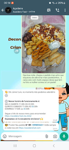 Coloquei 1 estrela se enfeite quase, atendimento péssimo, no ifood fala 60 minutos, demorou 2 horas, ninguém responde no chat, ninguém atende ligações, isso já era 00:30 e a loja fecha 23:30, eles não tem q capacidade de dar um parecer aí cliente pq pra mim tinham esquecido meu pedido, mas nesse momento meu namorado foi até o local que n é longe de casa e adivinha? O cara nem sabia qual era o pedido, alguns min depois chegou, tinha acabado de fazer, o motoboy disse que estava lotado de pedido. A assistência que a empresa presta é péssima, até mandei mensagem depois relatando, mas deve ser uma loja que não tem gerente ou não sei. Enfim, não comprem. A comida TMB é bem mediana, o doce de leite do churros é meio salgado, a carne do lanche parece de uma qualidade ruim e tinha um gosto de peixe, não sei explicar, tem opções mil vezes melhores na frente, é melhor fazer um...