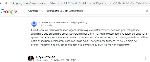 A mensagem enviada foi: "Nossa equipe de gastronomia visitou o Alameda 170 de forma anônima e provou algumas especialidades da casa. Com base na avaliação, o restaurante será reconhecido como uma das referências da cidade e um dos destaques do Brasil em 2025."