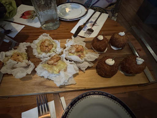 Fomos almoçar no dia das mães. Fizemos uma reserva para as 14h e ao sentar em uma mesa no pátio, fomos informados que, devido ao frio, assim que liberasse uma mesa no salão a gente seria realocado. Um pouquinho de despreparo aqui, um pouquinho de confusão ali, conseguimos ir para o salão, em uma mesa muito pequena para 4 pessoas. Entendemos que o espaço é pequeno e a demanda grande devido a data comemorativa, então não foi um grande contratempo. O atendimento é muito afetuoso, mas falta um pouco de preparo da equipe, as vezes um tanto confusos e afobados. Os drinks autorais são uma verdadeira obra de arte. Um pouco doces para o nosso paladar, mas muito gostosos mesmo assim. Não achamos que o gin de araucária combinou muito com o negroni, e sentimos falta de mais opções de drinks com bourbon. Pedimos quase todas as entradas e o arancini de pernil foi o que mais se destacou, mesmo tendo vindo um pouco frio na primeira vez que pedimos (sim, mesmo assim, bom a nível de repetirmos o pedido, que na segunda vez veio mais quentinho!) Perfeito, sem o que tirar nem por. O menos querido foi o tartine gravlax, muito bonito mas um tanto insípido. As folhadas de brie dividiram opiniões… eu particularmente amei, meu marido achou muito doce, mas realmente é uma questão de gosto pessoal. A cesta de pães não é nada de mais e também não é tão generosa como diz o cardápio, mas o guacamole estava divino, nota mil (inclusive é o ponto alto do crocante de camarão)! De prato principal escolhemos o risoto de tomate e limão siciliano, que estava cozido no ponto correto, porém sentimos falta da presença do sabor do limão. No mais, bem gostoso. Pedimos também os Polpetones que estavam bem gostosos, mas de alguma forma o queijo ralado que vem acompanhando acabou dando uma desequilibrada no molho. Nada que estragasse a experiência. De sobremesa fomos na namelaka, que estava muito saborosa mesmo, porém a textura passa longe do que deveria ser. O café estava morno e para mim precisa estar quente. No mais a experiência foi bastante agradável como um todo, faltando talvez apenas uma lapidação. O único ponto que realmente nos decepcionou foi que o restaurante não oferece água filtrada da casa, um gesto que considero de muito bom gosto, até para incentivar a hidratação entre um coquetel e outro. Resumindo, uma experiência agradável, um lugar muito bonito, atendimento caloroso porém com espaço para melhoras e a comida boa mas não...