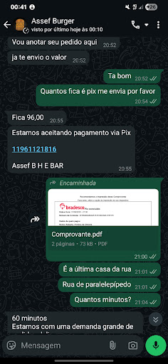 Péssima experiência! Além de um atendimento ruim e grosseiro!!Simplesmente revoltante! Fiz meu pedido às 21h e fiquei esperando até 23h30. Primeiro, fiz o pedido a atendente disse que estava tudo certo e que era 60 minutos para entrega passado um bom tempo questionei e a atendente disse que o pedido estava sendo embalado; depois, que já tinha saído para entrega. Só depois de eu questionar novamente sobre a demora, o dono me mandou um áudio me acusando de querer dar golpe (ele apagou o audio mas nao adianta porque eu ja havia compartilhado pra o WhatsApp do meu marido e tenho aqui como prova). Motivo- ocorreu um erro na conta... Até então eu nem sabia que o PIX tinha dado erro, (pois quem fez o pagamento foi meu marido), do trabalho, durante o turno da noite. Ele me mandou o comprovante e, por isso, eu tinha certeza de que estava tudo certo — não havia como eu imaginar que o valor tinha voltado, já que ninguém teve a decência de me avisar. Resultado: fiquei sem fazer jantar esperando pelo pedido que nunca chegava, com meu filho de 2 anos em casa, acreditando nas mentiras de um atendimento totalmente despreparado. Além da demora absurda para responder tem que ficar ligando a todo momento, e ainda tive que passar pela humilhação de ser chamada de ladrona. Um verdadeiro absurdo, falta total de respeito e profissionalismo o dono se comporta como uma piada e não como um empresário serio e certo. Nunca mais volto e faço questão de alertar outras pessoas para não passarem pelo mesmo...