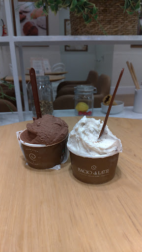 O ambiente em si é muito agradável. Dentro do estabelecimento, há ar condicionado, banheiros privativos, cadeiras confortáveis e mais espaço do lado de fora. Porém, desde sua inauguração, essa área tem sido frequentada por crianças que pedem sorvete não só aos funcionários, mas também aos clientes! Seja você sentado do lado de fora (para aproveitar o sol e a brisa agradável) ou dentro (para mais conforto e "segurança"), elas vêm em grupos pedir esmola. Em outras ocasiões, o ambiente, especialmente nos finais de semana, fica extremamente lotado, com alta demanda e pouca eficiência por parte dos funcionários. Donos de pets levam seus cachorros e acabam causando confusões com outros animais, gerando desconforto devido aos latidos. Além disso, muitas vezes, pais levam suas crianças que acabam entediadas e correndo entre as mesas, incomodando aqueles que desejam apenas sentar e saborear um sorvete. Quanto ao serviço dos funcionários, também deixa a desejar, pois muitas vezes parecem desinteressados. Ao ir tomar um gelato na Bacio di Latte, parece que estou entrando no Subway. O gelato em si, em todas as franquias, é sempre o mesmo, mas minha crítica à marca é que o copo é caro e pequeno demais. Pelo preço cobrado, é frustrante que o sorvete não chegue até o final do copo; na hora de servir, eles só colocam nas bordas, criando uma pequena montanha para parecer que há muito sorvete, mas quando você começa a comer, percebe que é pouco e se questiona se deve comprar mais um. No final das contas, você sai de lá com 40 reais a menos, muito insatisfeito com todos...