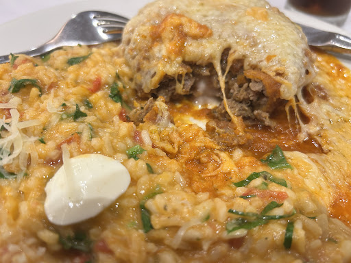 The main course turned out to be a large hamburger covered in melted cheese served with a tasteless risotto. Absolutely revolting.