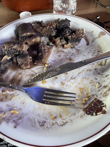 Um rapaz que aparentava ser o gerente, por não estar de uniforme, me perguntou se estava tudo bem e mostrei o prato de gordura e cartilagem que havia separado. Ele pegou a colher que estava na tigela e passou a mexer na cumbuca. Não encontrou nenhuma carne, mas disse apenas que feijoada tinha gordura mesmo ?!