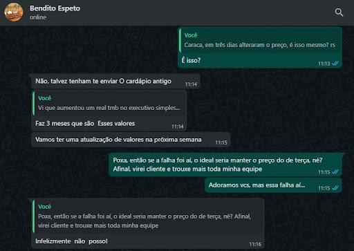 Hoje minha equipe e eu realizamos um pedido e percebemos uma diferença nos valores. Ao questionar, me disseram que no atendimento anterior mandaram a tabela errada. Por ética e cordialidade, entendo que deveriam ter fechado esse pedido com o valor base que eu tinha e me alertado que no próximo seria da tabela certa, mas se negaram: "infelizmente não posso".