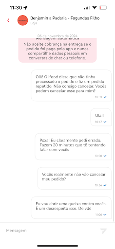 Não tive nem lembrança de resposta pelo chat. É uma tremenda falta de respeito com os clientes e os entregadores, que ficam esperando à toa sem receber por isso.