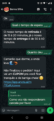 Atendente não se importa em prestar um bom trabalho, parece estar fazendo um favor, perguntei se aceitava VR ela afirmou que sim, quando o motoboy chegou, não aceitou, mandei msg ela falou, esse não aceita, benéficos da empresa VR, acredito que ela só começa o alelo sei lá, , pois perguntei e eu não poderia gastar naquele momento, poderia ter mandado o pedido de volta mas seria errado com motoboy ao meu ponto de vista, quando falei para ela que não certo, pois perguntei antes, ela só falou tá bom senhor, boa noite! A empatia muito boa! Kkk Acredito que venham a perder muito clientes por esses tipos de atitude! Foi a primeira vez que comprei e sinceramente, não...